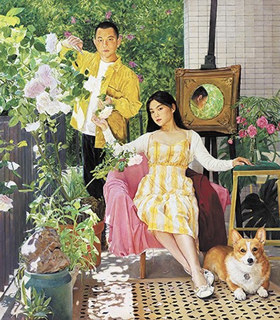 在《微风拂过》的创作中,曹惠娣选择了“局部推动”的艺术逻辑,耗时1个多月,从右下角小狗起笔,逐次过渡到女性、男性,以及最后阳台的绿景。曹惠娣表示,这种创作方式的优点在于用细腻笔触承载了生活温度。小狗的毛发纹理、女性裙摆的褶皱层次、男性衣料的质感、绿植的光影变化,每个元素都在她的创作中缓慢生长。待局部细节趋于完善后,她再以全局视角进行调整,让各元素在视觉节奏与艺术表意上达成和谐,最终使画面既保留微观的细腻触动,又呈现完整的宏观表达。