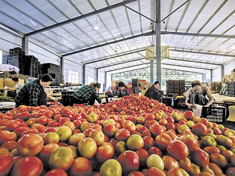 图为近日,该县竹贤乡石院村蔬菜集散中心内,工人正对丰收的西红柿进行分拣、装箱。 董存春 摄